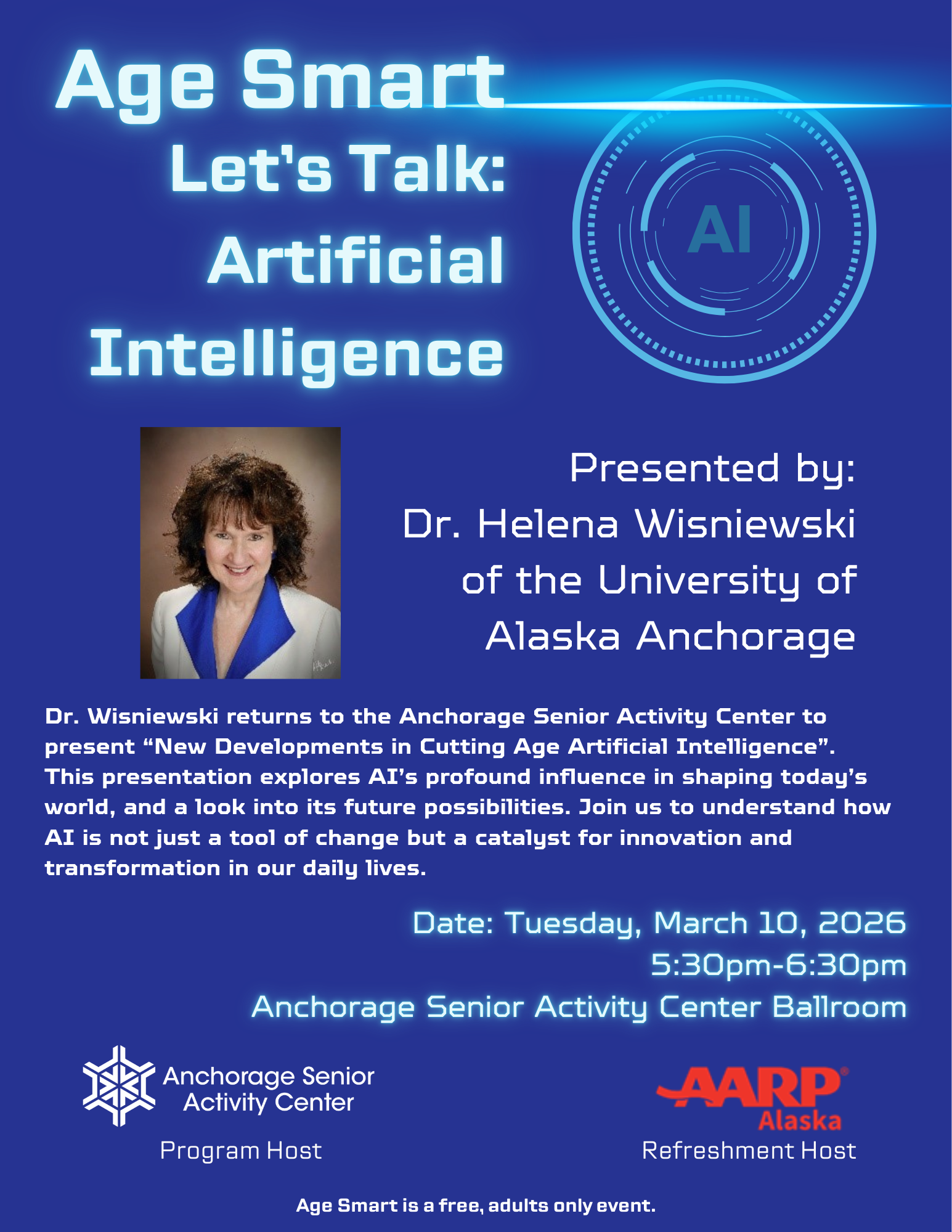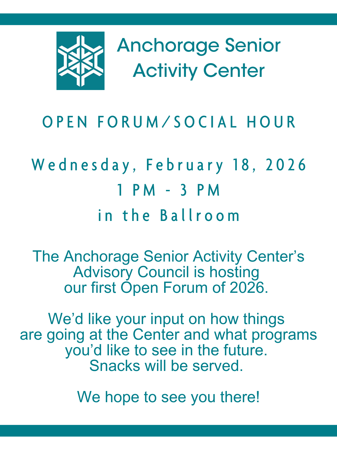 The mission of the Anchorage Senior Activity Center is to enhance the quality of life of older adults by promoting fitness, health and wellness, nutrition, social interaction and cultural enrichment.