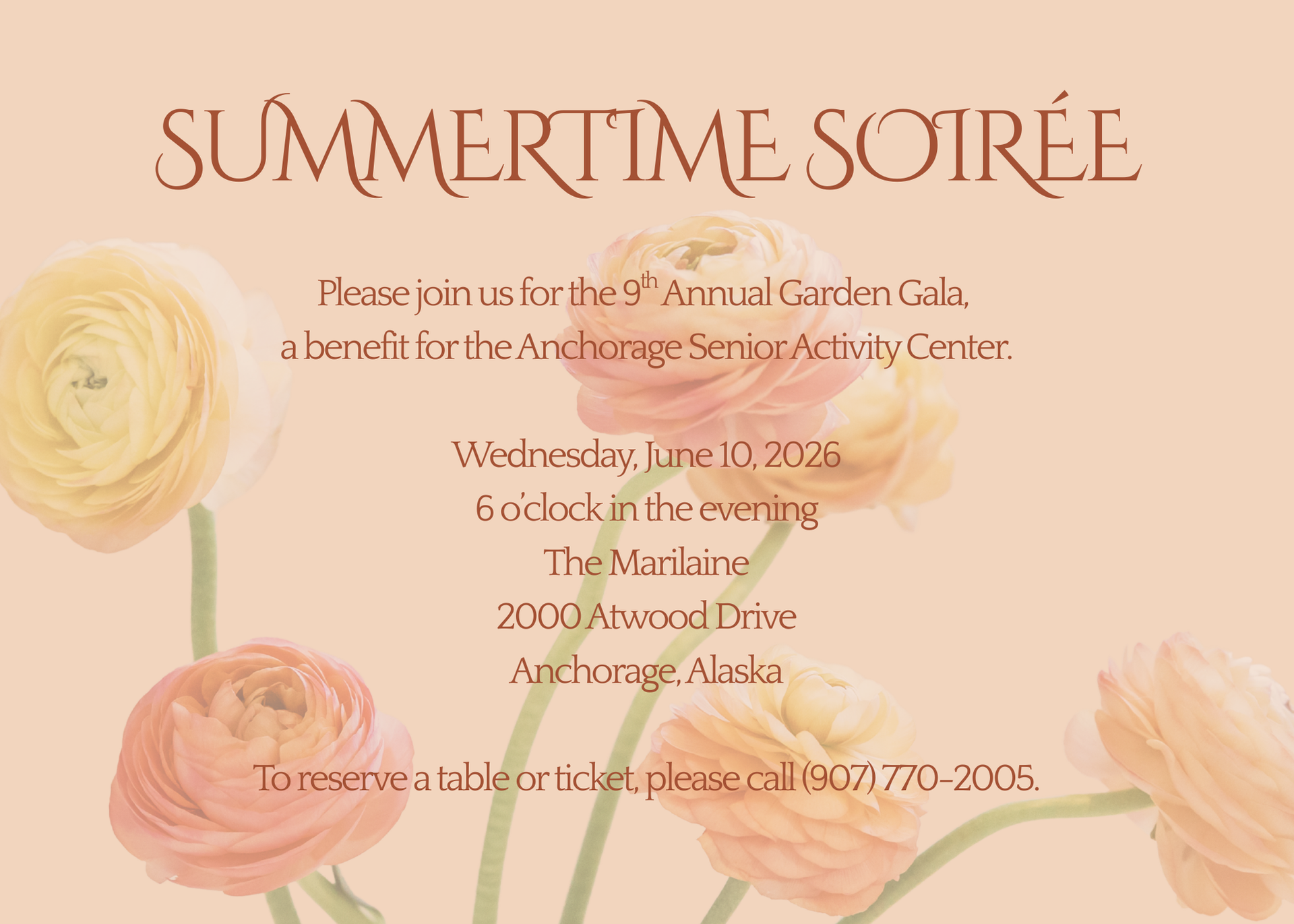 The 2026 Garden Gala will once again be graciously hosted by John and Candace Hendrix in their beautiful gardens at The Marilaine. All proceeds support the Anchorage Senior Activity Center’s mission – keeping our seniors healthy, involved, and a vibrant part of the Anchorage community.